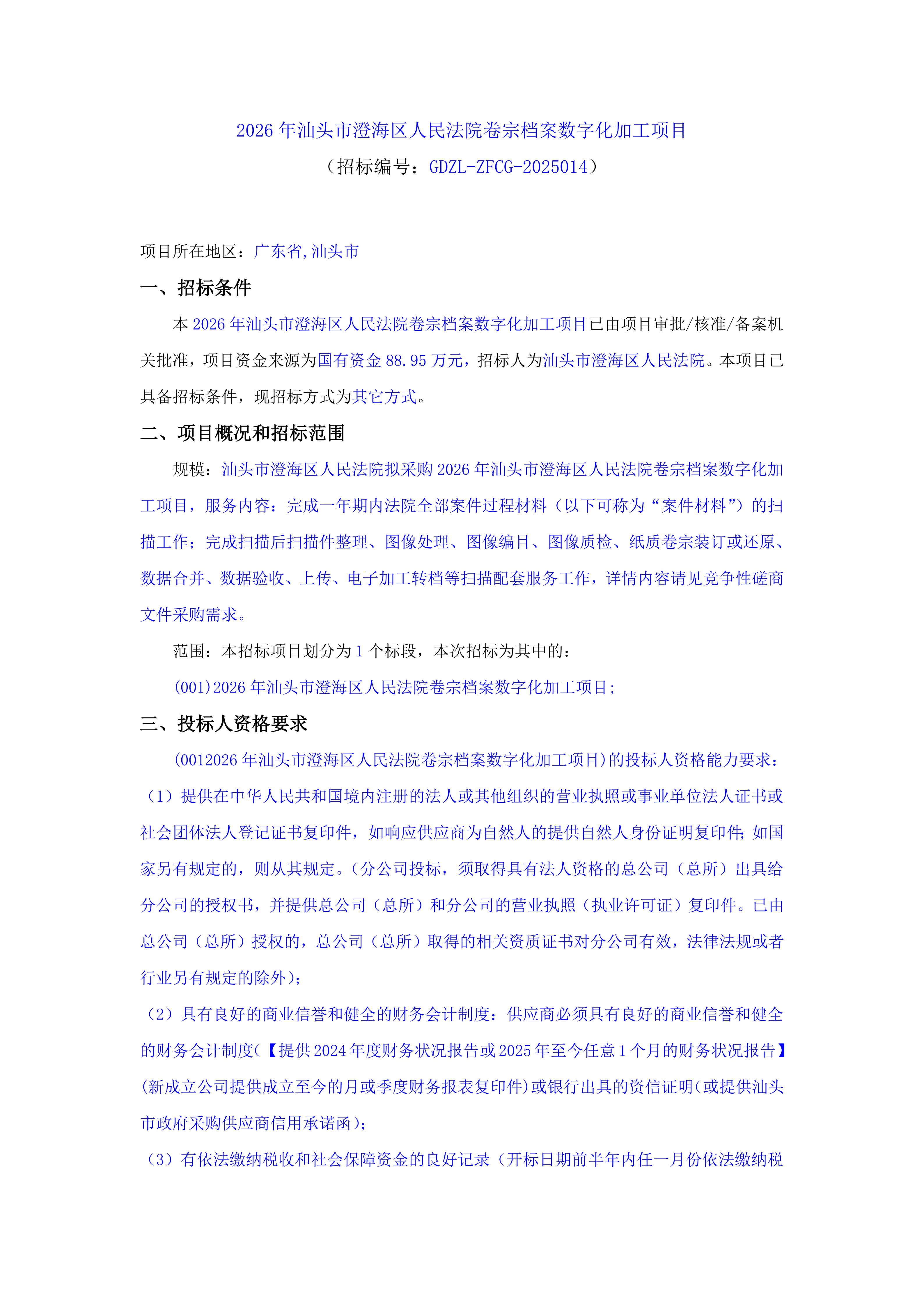 2026年汕头市澄海区人民法院卷宗档案数字化加工项目