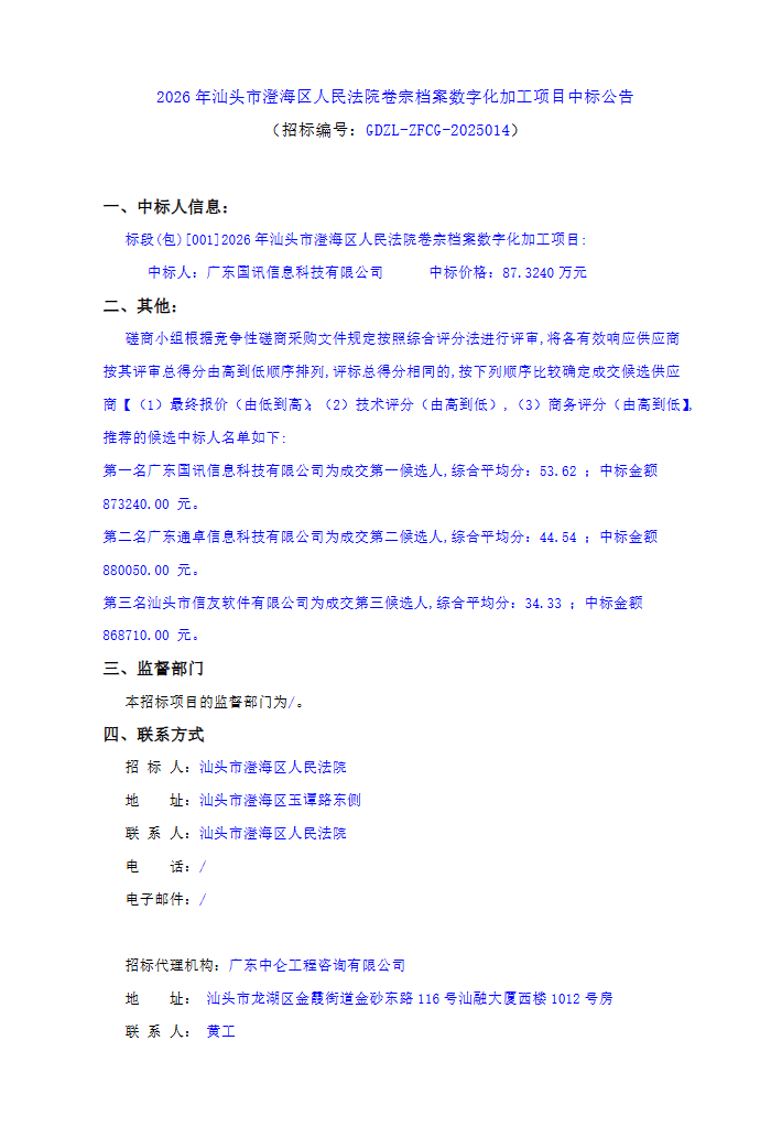 2026年汕头市澄海区人民法院卷宗档案数字化加工项目中标公告