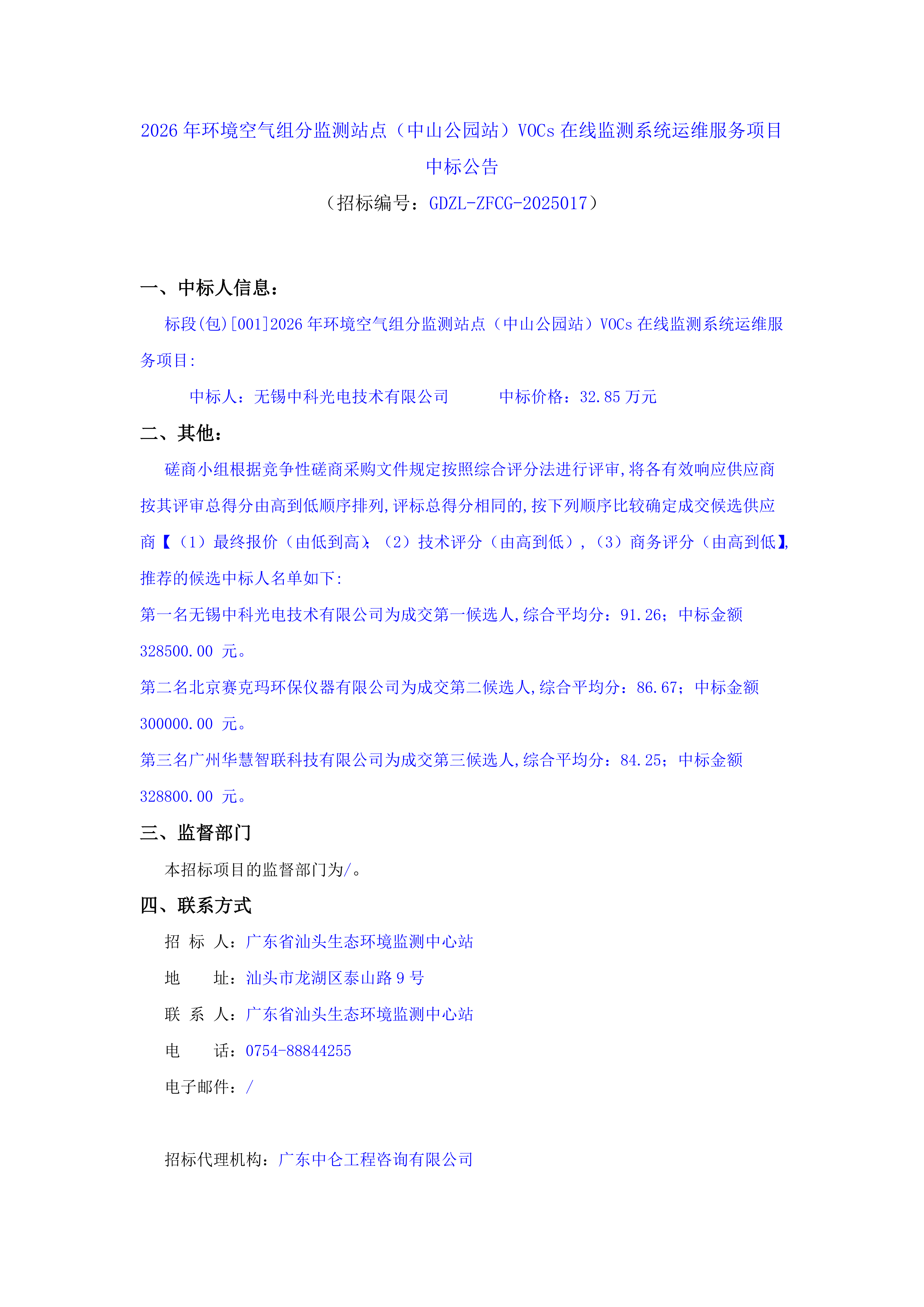 2026年环境空气组分监测站点(中山公园站)VOCs在线监测系统运维服务项目中标公告